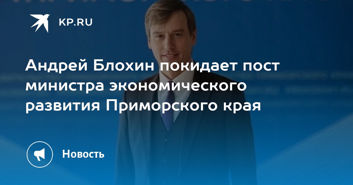 Андрей Блохин покидает должность министра экономического развития Приморского края в связи с переходом на новое место работы. Исполнение обязанностей главы ведомства возложено на его заместителя Евгению Чавкину. Об этом сообщает «Комсомольская правда – Владивосток» со ссылкой на министерство экономического развития Приморского края.